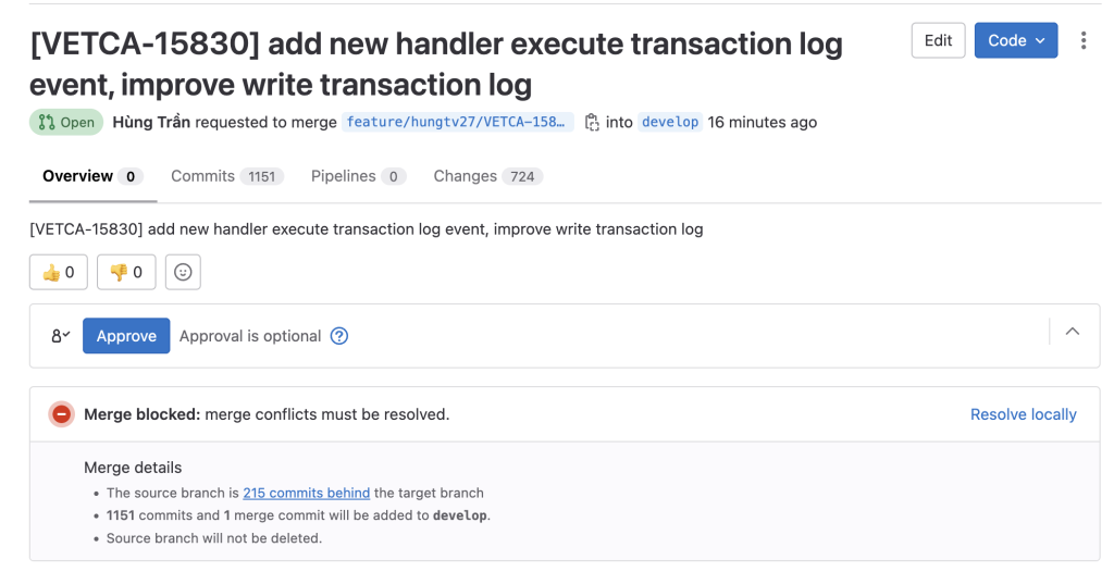 Đây là điển hình của việc không làm sạch code trên nhánh develop (sai khác nhiều so với master), khiến việc tạo merge request từ các nhánh feature vào nhánh develop gặp rất nhiều thay đổi.