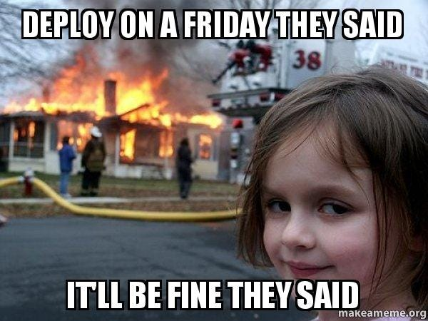Đây là một rule làm việc khá tốt với team mình, việc golive vào thứ 6 đi kèm khá nhiều rủi ro về lỗi và nguồn lực.