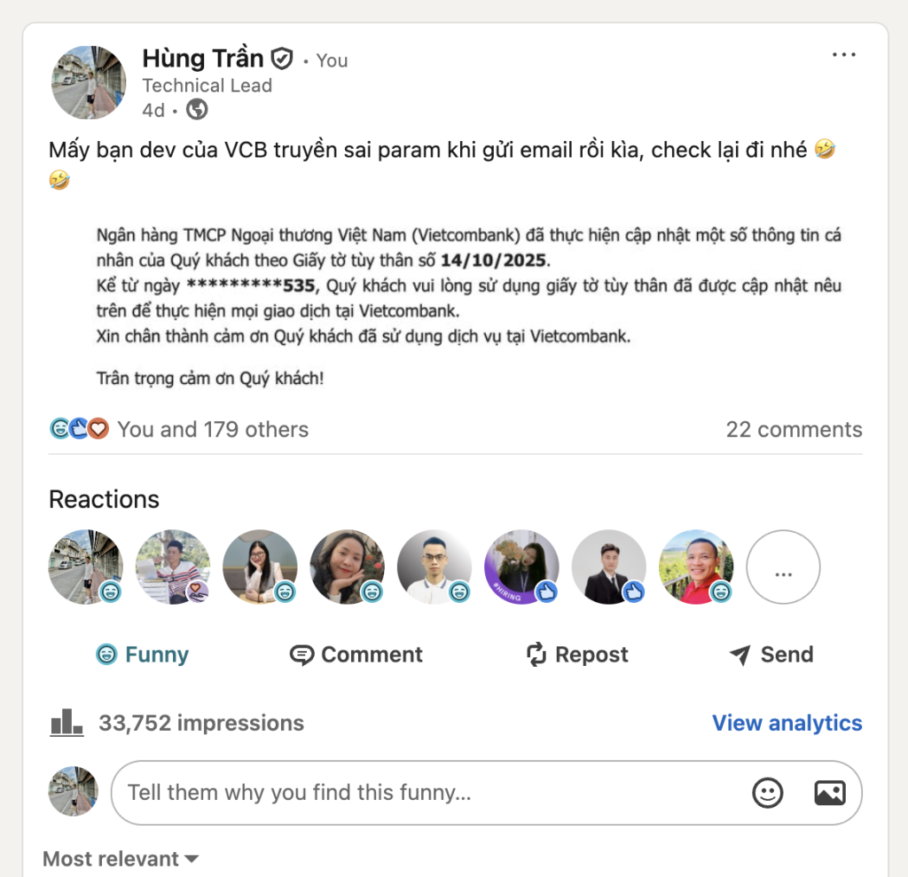 Xong mình thấy buồn cười ở nội dung email, đăng lên linkedin chơi chơi thì thấy tự nhiên viral ghê. À mà mình cũng không check được là họ đã sửa lỗi này chưa, bạn nào mà đăng kí mới tài khoản VCB thì gửi ảnh mình xem với nhé.